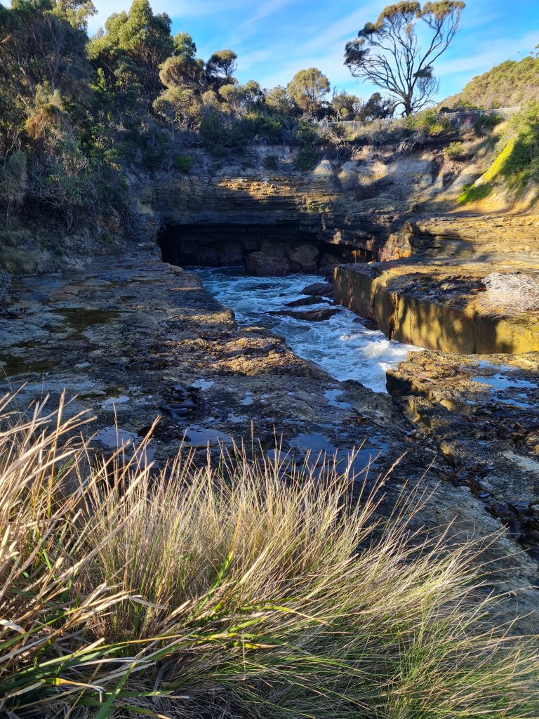 This is a blow hole, where the sea meets a rocking shoreline, and when there’s a big enough swell, crashes through to the other side.