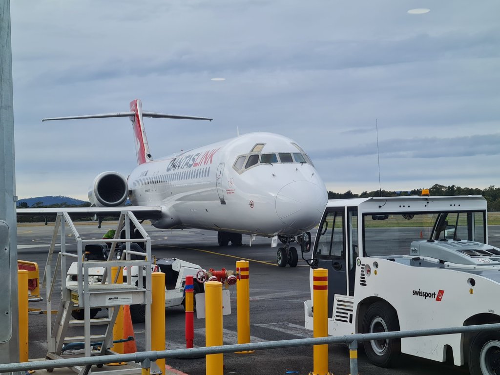 So, firstly, it looks like it’s at a regional airport, it’s a relatively small plane, and it’s a bleak sort of day. To qualify all that, it’s at Hobart, Tasmania, a capital city of one of the southern Australian states, but not a large one, so the airport doesn’t have airbridge gates, you still get that walk-out-to-the-plane feeling.