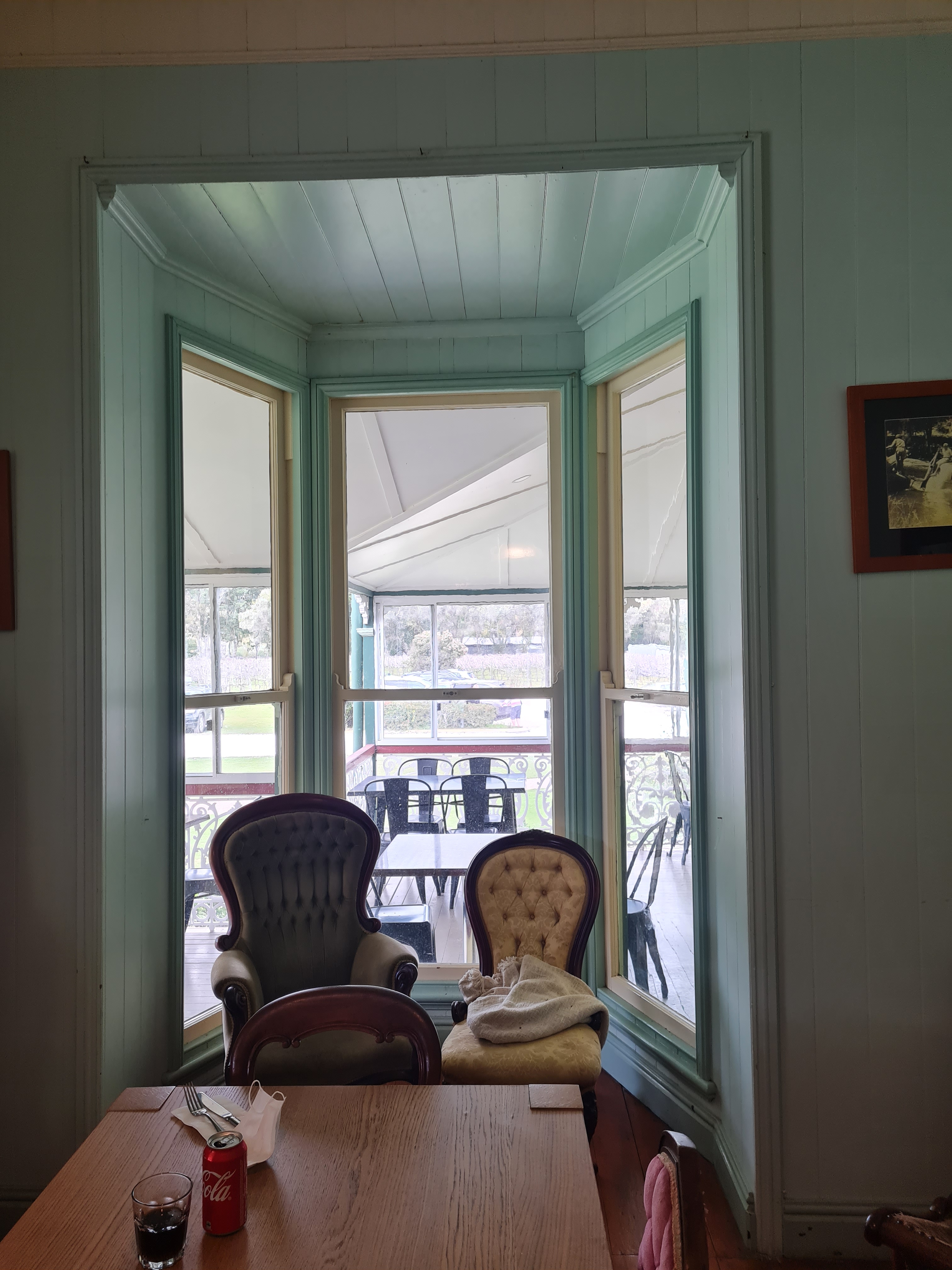 At one end, a large bay window, which would be ideal to sir and view the outside, past the sweeping verandah. There is a small lawn and a rotunda, but beyond that what might have been extended gardens, is the vineyard.